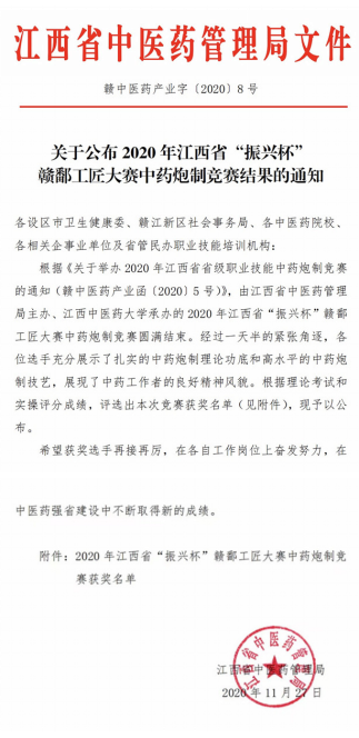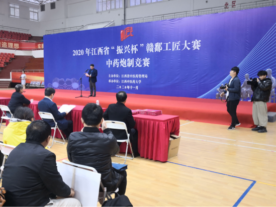 为贯彻落实党的十九大提出的“建设知识型、技能型、创新型劳动者大军,弘扬劳模精神和工匠精神”,推动全省高技能人才队伍建设,促进中医药事业传承创新发展,提高中医药服务能力水平,11月21日至22日,2020年江西省“振兴杯”赣鄱工匠大赛中药炮制竞赛在学校体育馆举行。来自全省多家中医药企事业单位及部分中高等医药院校74人组成的20支代表队参赛。