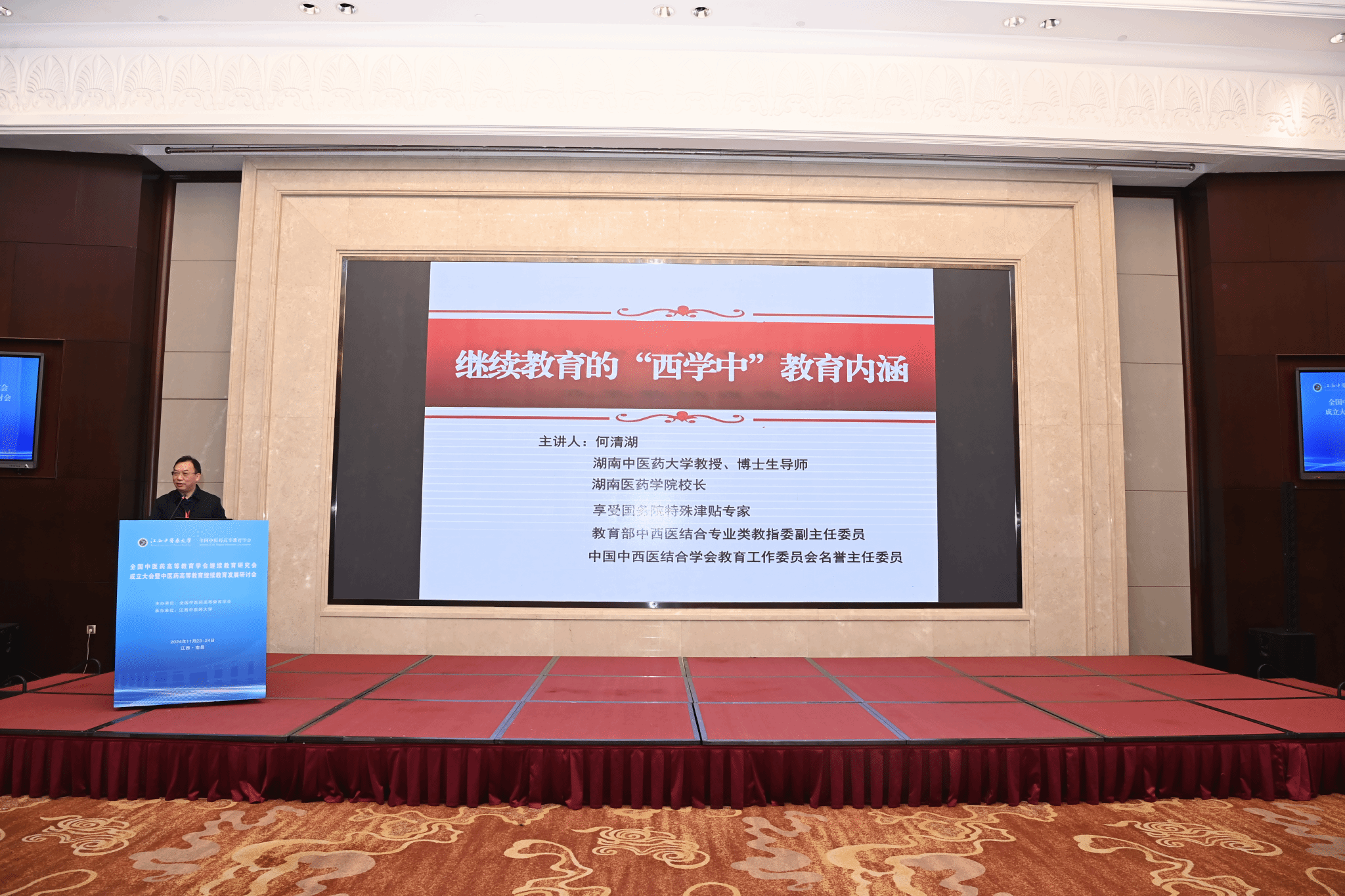 在专题讲座环节,湖南医药学院校长何清湖以《继续教育的“西学中”教育内涵》为题作报告。他从“西学中”的背景、为什么“西学中”、“西学中”学什么、“西学中”怎么学、“西学中”的实践、“西学中”教材建设等六个方面展开报告。